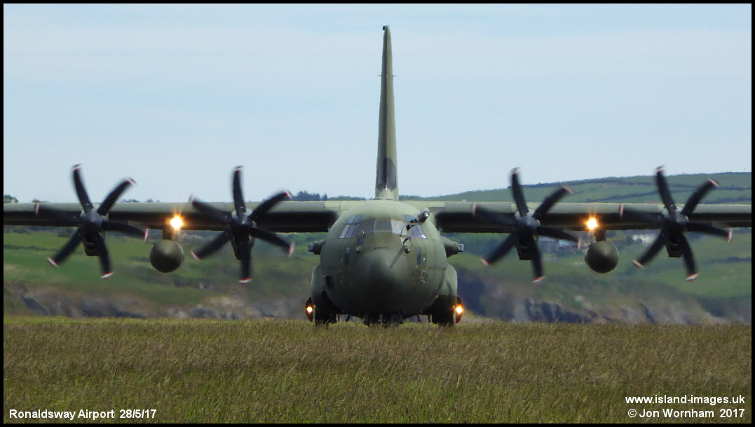A head on view of 'Fat Albert' as RAF Hercules C4 ZH873 lines up on runway 26