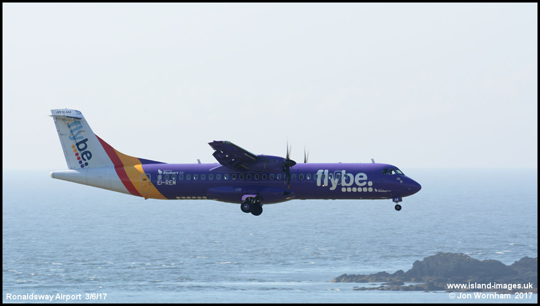 One of the two Stobart Air ATR72-500s based at Ronaldsway to operate FlyBe flights, EI-REM pictured on final for runway 26.