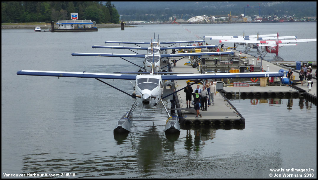 Two of the six piers available at the airport, with seven DH Turbine Otters present. The pontoon behind is a 'floating gas station' for boats!