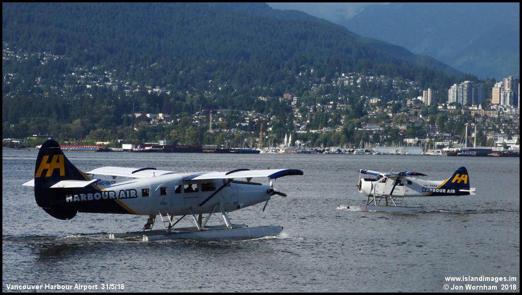 Harbour Air Turbine Otter C-GLCP (311) taxies out while Beaver C-FEBE holds off awaiting ground staff on its pontoon to help with mooring.
