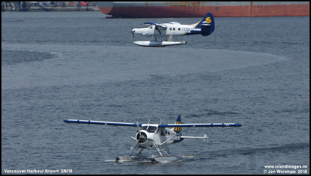Harbour Air Turbin Otter C-FLAP is airborne as Beaver C-GMKP (222) taxies in.
