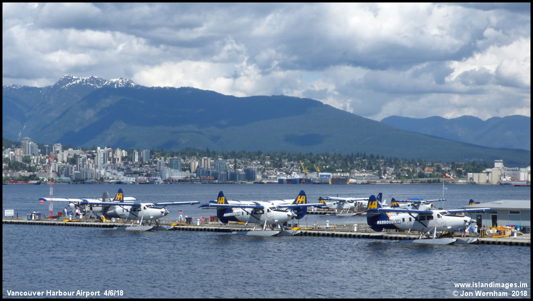 The busy Vancouver Harbour Airport with eight seaplanes on the pontoons.