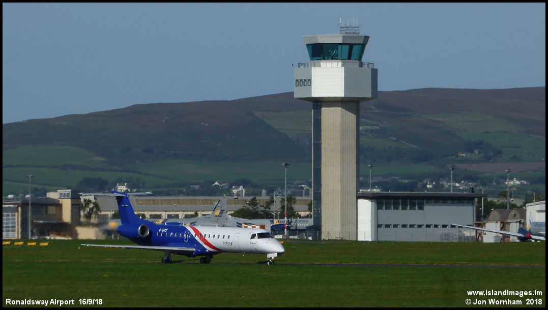Eastern Airways ERJ145 G-CIYX taxies past the Ronaldsway control tower, operating a charter flight to Inverness.