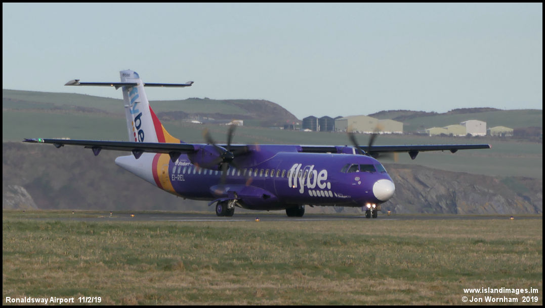 The second Stobart Air ATR72 operating from Ronaldsway in FlyBe colours, EI-REL, lines up on runway 26 operating a service to Liverpool.