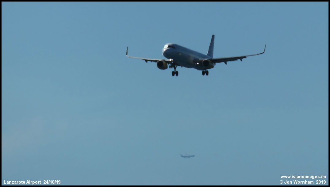 A Vueling Airbus A321 on approach to runway 03 at Arricife Airport with the next to land turning onto the ILS behind.