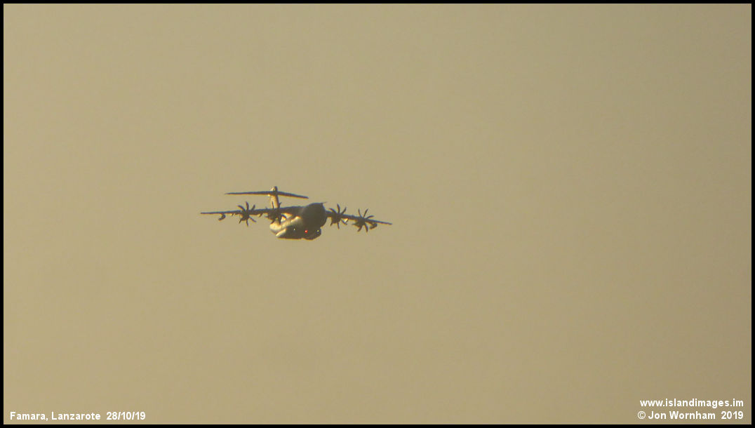An Airbus A400M, presumably Spanish Air Force? approaches Famara at low level over the sea at sunset.