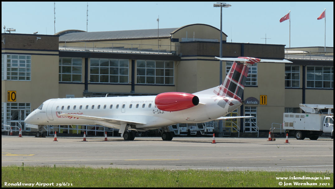 Current based Loganair ERJ145 is G-SAJI pictured parked on stand 10. It was delivered new to British Regional Airlines at Ronaldsway as G-EMBN on 2/12/99