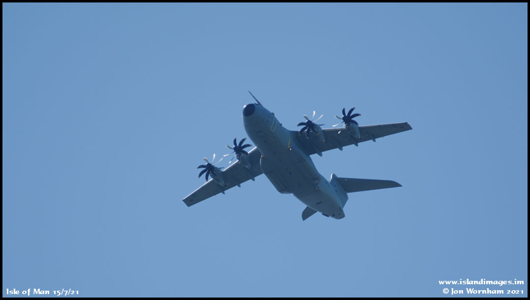 RAF Airbus A400 Atlas ZM411 'Ascot 469' flys over Douglas on a training sortie from its home base at RAF Brize Norton.