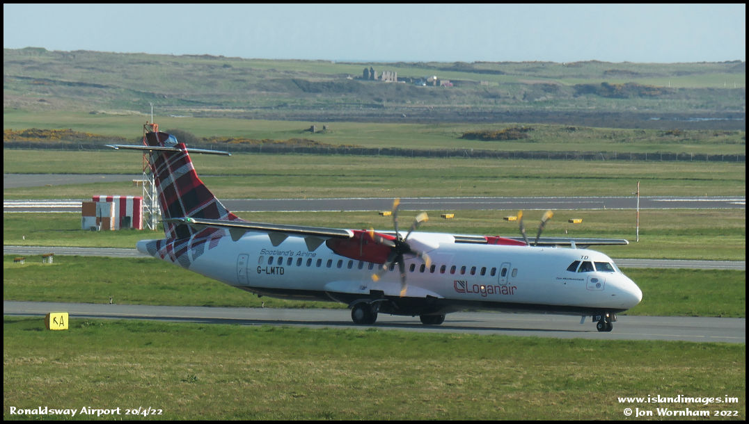 Pictured from the departure lounge, Loganair ATR72 G-LMTD taxies to the apron