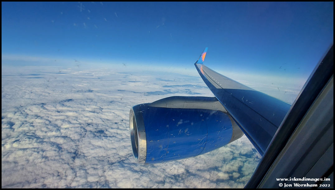 A wide angle phone picture, somewhere between Arrecife and Manchester in Jet2 Boeing 757 G-LSAC. Seat row 15 is quite good in this aircraft!