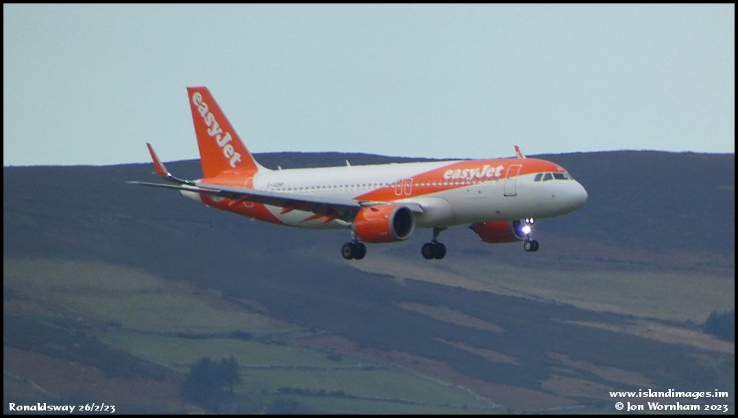 Taken at quite a distance from the airport, easyJet Airbus A320 Neo G-UZHP on short final to runway 08 at Ronaldsway.