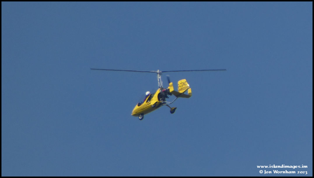 In the past, Ronaldsway used to be inundated with visiting light aircraft during the TT Race Week, but now there are very few. Two unusual vistors this year were a pair of Gyrocopters. This Rotorsport MTOsport G-CGNC is passing Onchan.