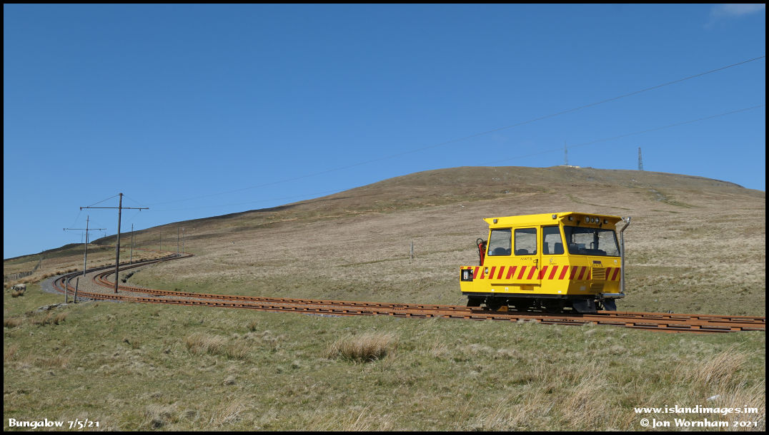 The NATS railcars are used for ferrying technicians to the radio site on Snaefell summit when the Mountain Railway is not running. This is the fourth one to be used and is seen at Bungalow with the summit behind.