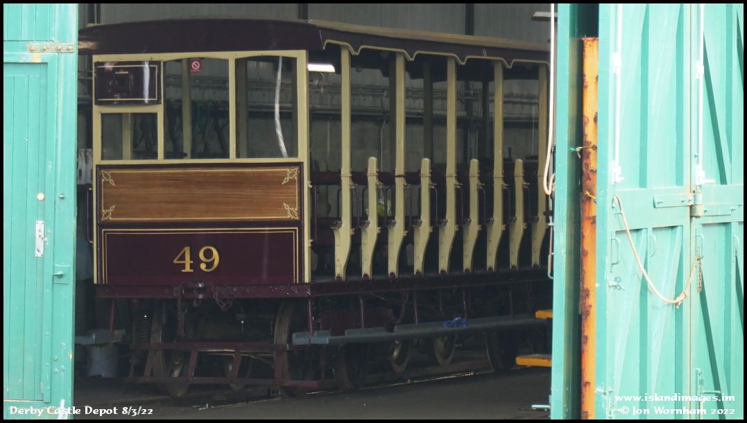 Trailer No 49 lurks inside the running shed. One of six delivered together with three power cars, for the opening of the line to Groudle in September 1893. The following year the line was open all the way to Laxey.