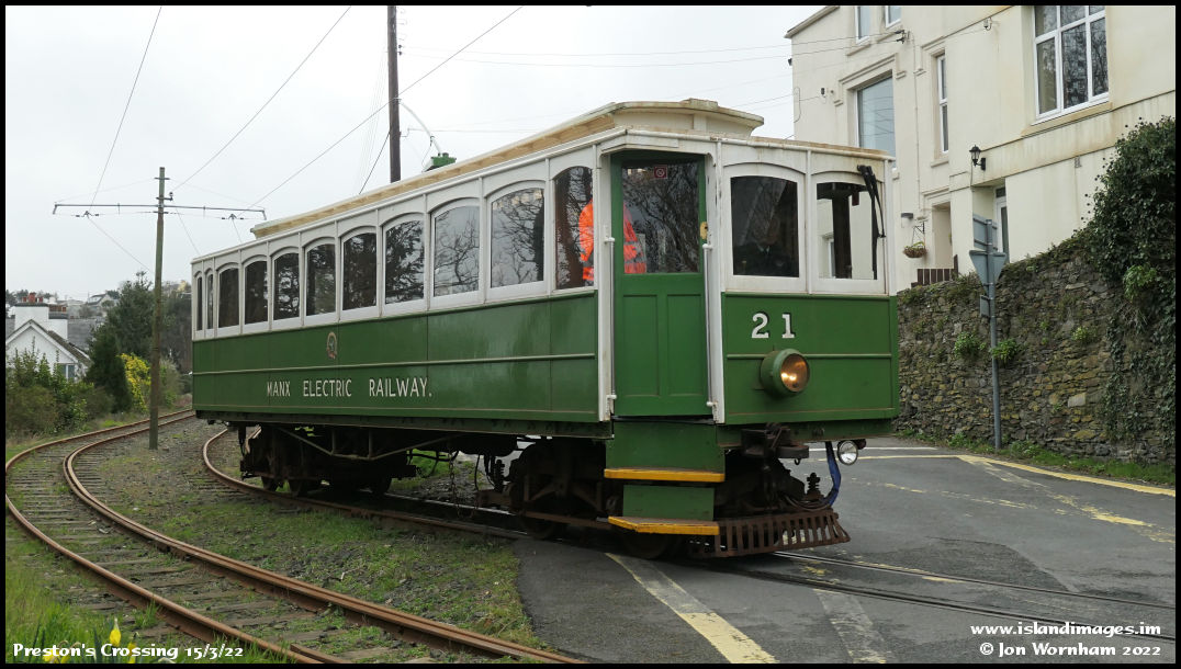 Car No 21 crosses the road down to Laxey Harbour and the beach.