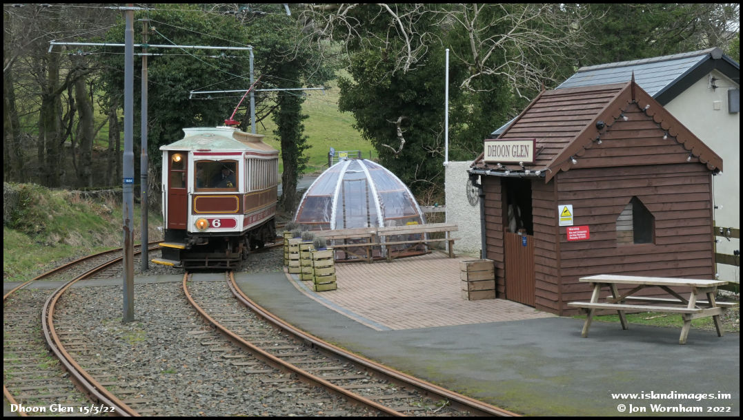 After a wait of around 15 minutes, Car No 6 appears at Dhoon Glen, heading from Ramsey to Laxey and Douglas.