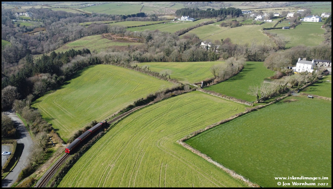 A bit lost in the landscape, but I wasn't actually doing the flight to shoot the train. 'Loch' on the 'S' bends before Port Soderick Station, which can be seen through the trees.