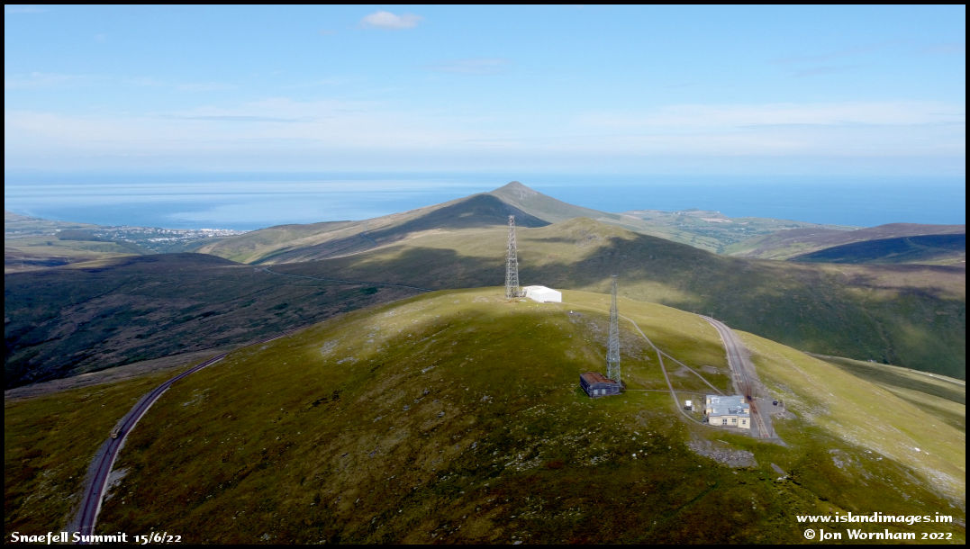 Another aerial view showing how the mountain railway curves around the summit. Car No 5 is now on the descent to Bungalow and Laxey.