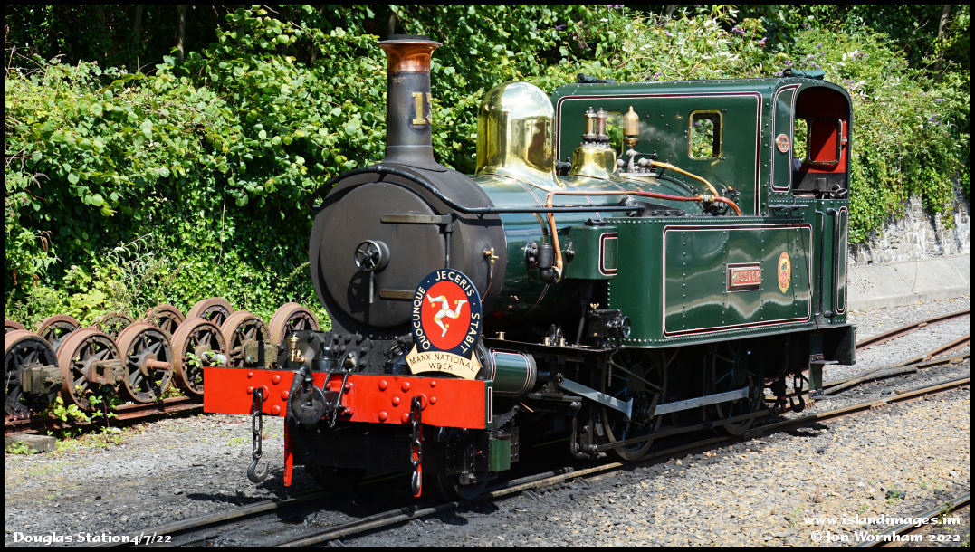 'Kissack' on the release road running to the engine shed. Trains are carrying 'Manx National Week' headboards all week, the annual open air Tynwald Day celebration is tomorrow and visitors from all over the world are on the island.