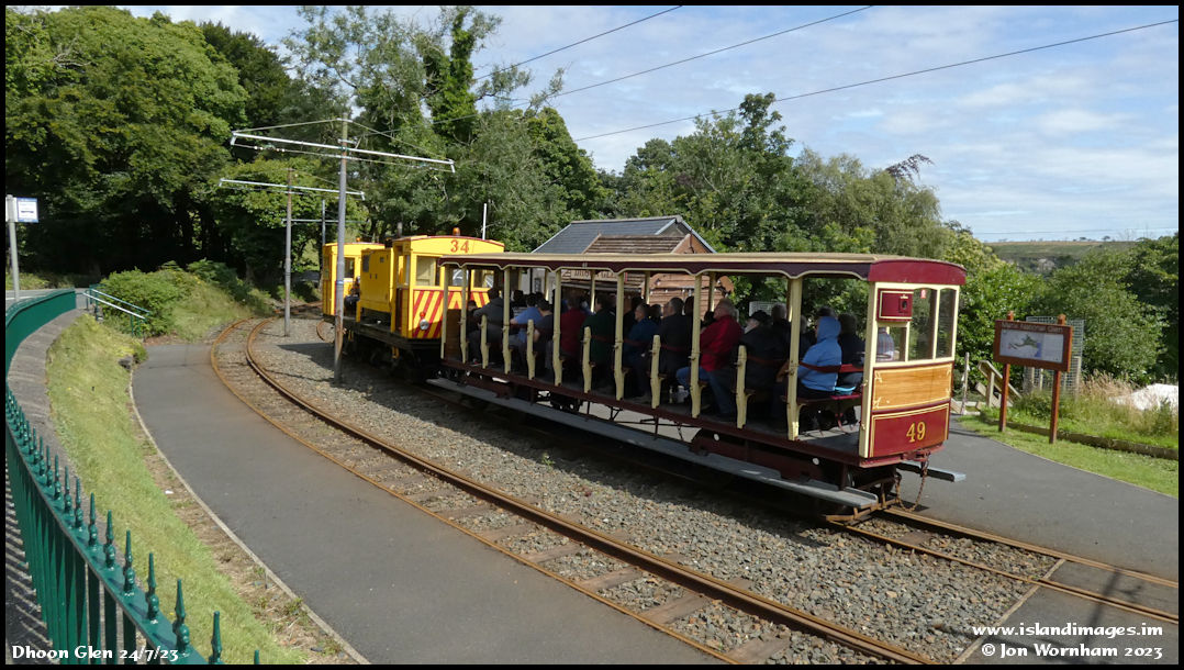 No 34 passing the Dhoon Glen halt and 'Little Shed' cafe with trailer No 49.