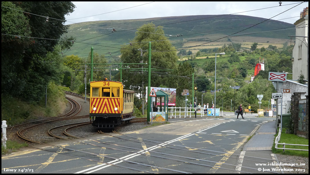 Back at Laxey, No 34 is about to cross the main road before entering the station area, with the Laxey Wheel as a backdrop.