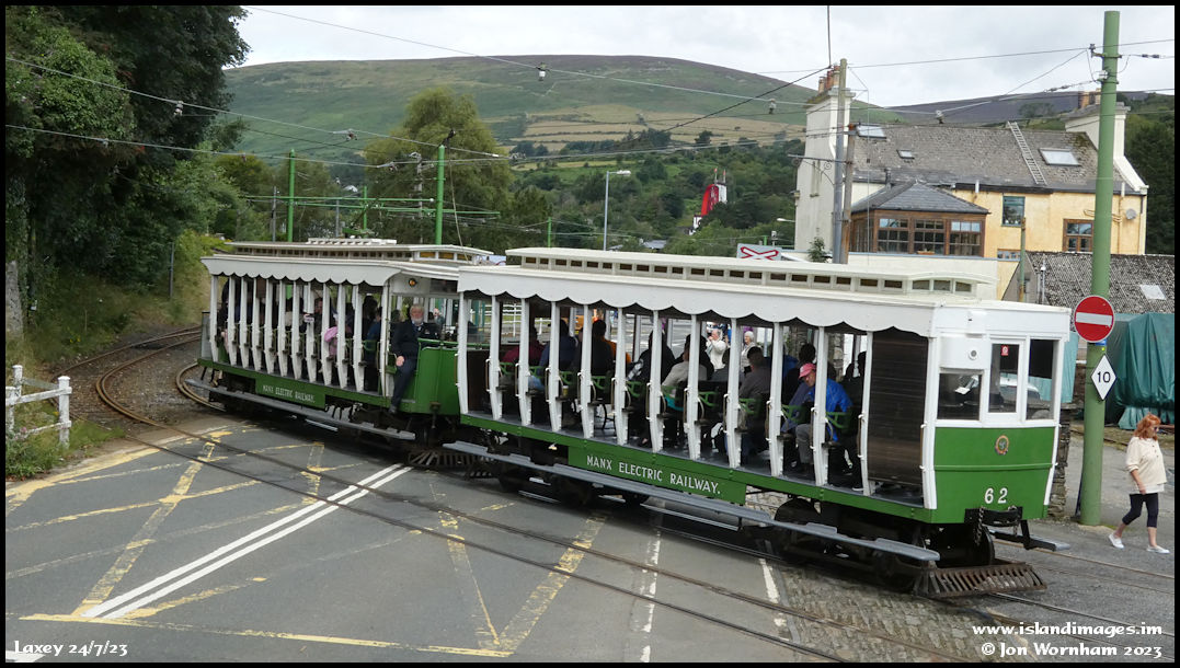 In matching 'Nationalisation Green' livery, crossbench Car No 32 and trailer No 62 cross the main road heading northbound. Both were delivered to the railway in 1906.