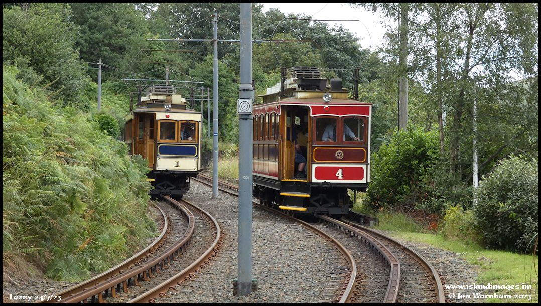 On the Snaefell Mountain Railway, Car No 1 has been waiting patiently for ascending Car No 4 to clear the single ttrack over the road, before it can enter the station.