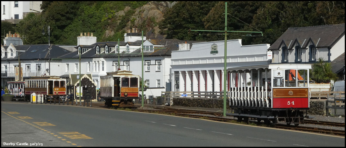 A 'wide' view capturing the scene at the Derby Castle terminus of the Manx Electric Railway. Car No 22 is ready to depart with the first service of the day, whilst Car No 20 runs around trailer 54, one of the original 6 trailers delivered in 1893.