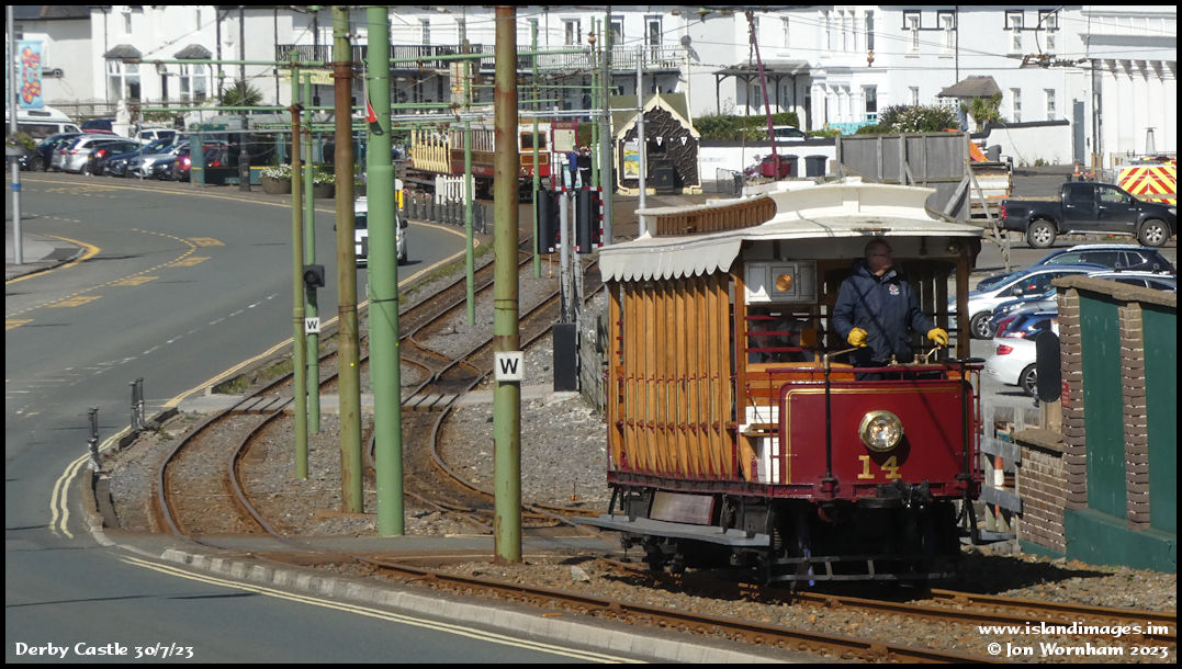 Car No 14 climbs up past the depot whilst No 5 can just be seen at the station through the poles