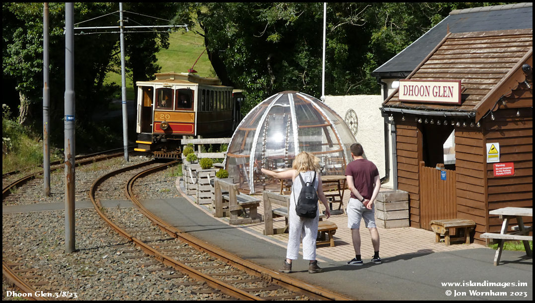 Two passengers waiting to head south from the Dhoon Glen give the required signal for the tram to stop, as Car No 20 comes into sight around the curve.