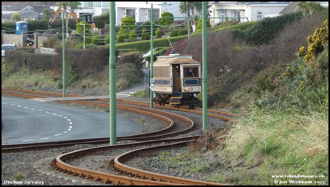 Car No 7 on the climb out from Douglas and near to the outskirts of Onchan. Of note are the topiary bushes in the garden above the tram roof!