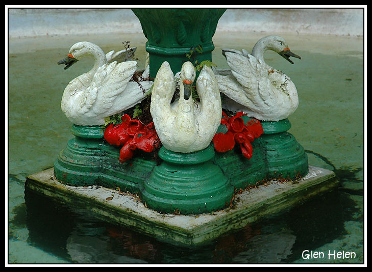 Ornamental swans on the fountain base at the Swiss Cottage