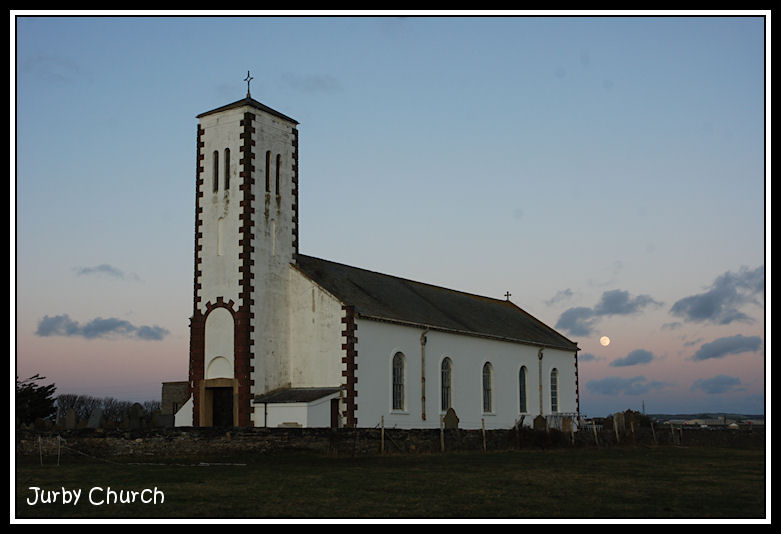 Jurby Church just after sunset, with the Moon rising behind